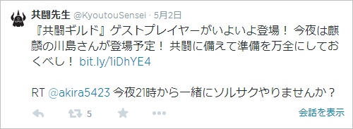 ちなみに芸人さんのプレイの状況は、共闘ギルドの公式ツイッター、共闘先生や、芸人さんのTwitterにて告知されていますよ。