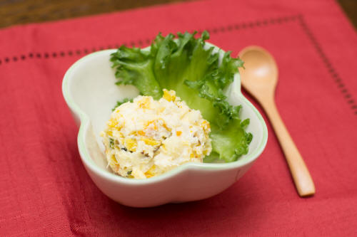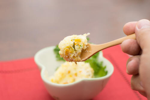 まずはポテトサラダを作ってみました。作り方は簡単で、赤のベジップスを細かく砕いて、いつものポテトサラダに加えるだけ。