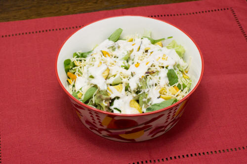レタス、ホウレン草を刻み、ベジップスを粗く砕いて乗せ、シーザードレッシングとシュレッドチーズを乗せたら完成です。