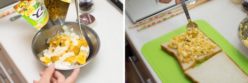 作り方は、ゆで卵を潰してみじん切りの玉ねぎ、細かく砕いた緑のベジップスとマヨネーズを和え、パンに挟むだけ。