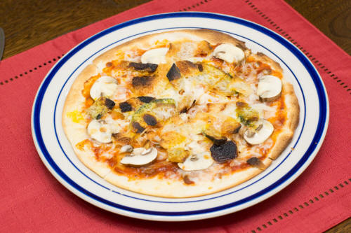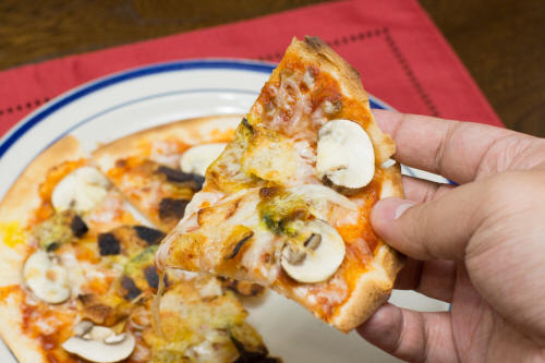 食べてみると、ベジップスがソースとチーズを吸い、ややしんなりサクッとした触感で、ピザとよくなじんで美味しい…。また一度揚げてあるので、そのまま野菜を乗せるよりも野菜の味が濃厚で美味しいんですよ。