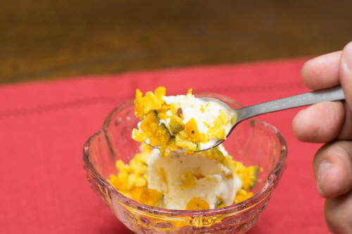 さてちょっとデザートに、細かく砕いた赤のベジップスをバニラアイスにかけてみると…おお、これはクランチアイス的なおいしさだ!