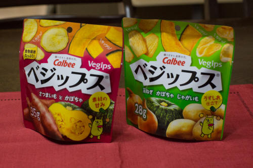 知らない人のために説明しておくと、ベジップスはカルビーが発売する野菜チップス。さつまいも+かぼちゃの赤、玉ねぎ+かぼちゃ+じゃがいもの緑の2種類が発売されています。