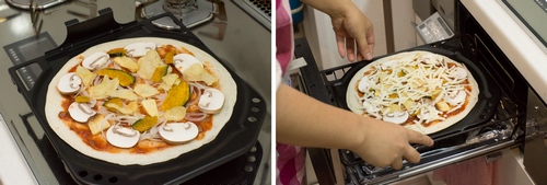 作り方は、生地にピザソースを塗り、スライスオニオン、マッシュルームを乗せた後に緑のベジップスをそのまま乗せ、チーズを振りかけて焼くだけ。