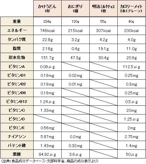 ちなみに夜食といえば、うどん、おにぎり、チョコレートなど、定番は色々とありますが、含まれる栄養素はまちまち。というかこうして比べてみて初めて知りましたが、カロリーメイトってたった200kcalしかないのに、いろいろな栄養素がバランスよく入ってるんですね。