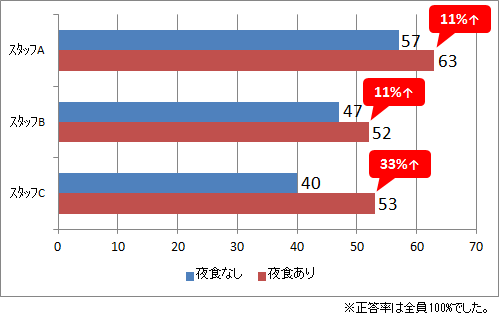 さて、では夜食を摂ることでどれだけ成績が違ったか、スタッフ3名によるテストの結果をどうぞ。