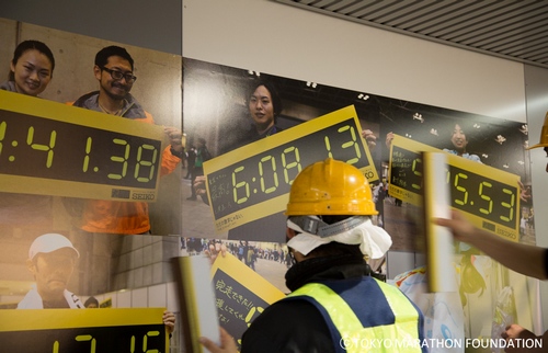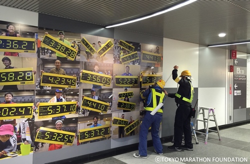 人通りの多い渋谷駅の通りに、大々的に掲出された、ランナーのタイム。