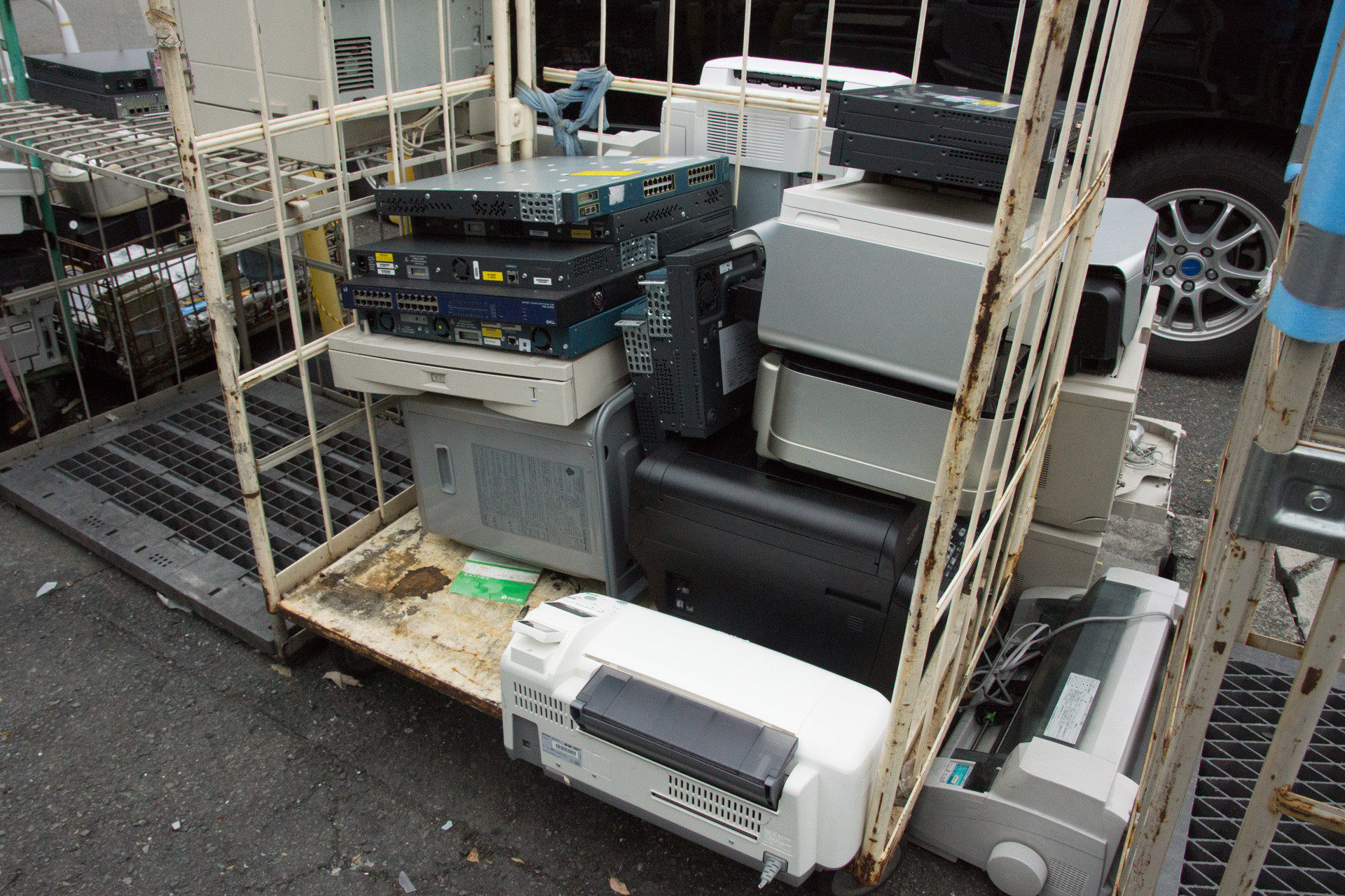 回収されたものの中には、灯油ファンヒーターやレーザープリンタ、業務用スイッチングルーターやビデオデッキ、炊飯ジャーなど、まさに多種多様。