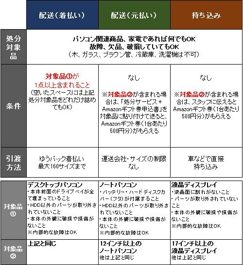 そして持ち込みや送料負担の場合、対象条件を満たしたディスプレイやパソコンがあれば、1台あたり500円のAmazonギフト券がもらえる嬉しい特典も。(ただし、配送の場合は申込書の同封が、持ち込みの場合はスタッフにAmazonギフト券サービスのことを伝えて申込書への記入が必要になります。)