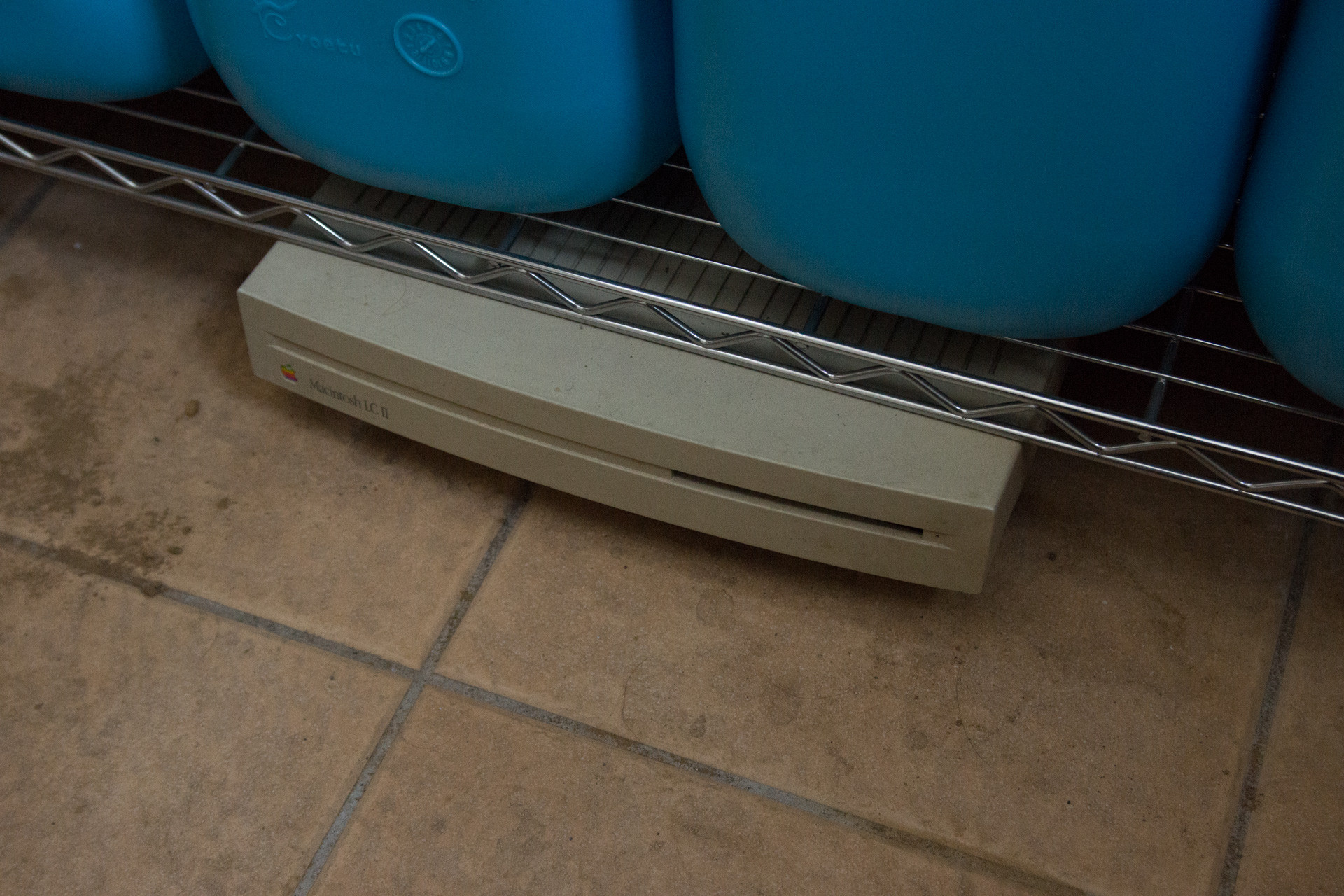 灯油缶の下に押し込まれた、かつての名機、マッキントッシュLCII。