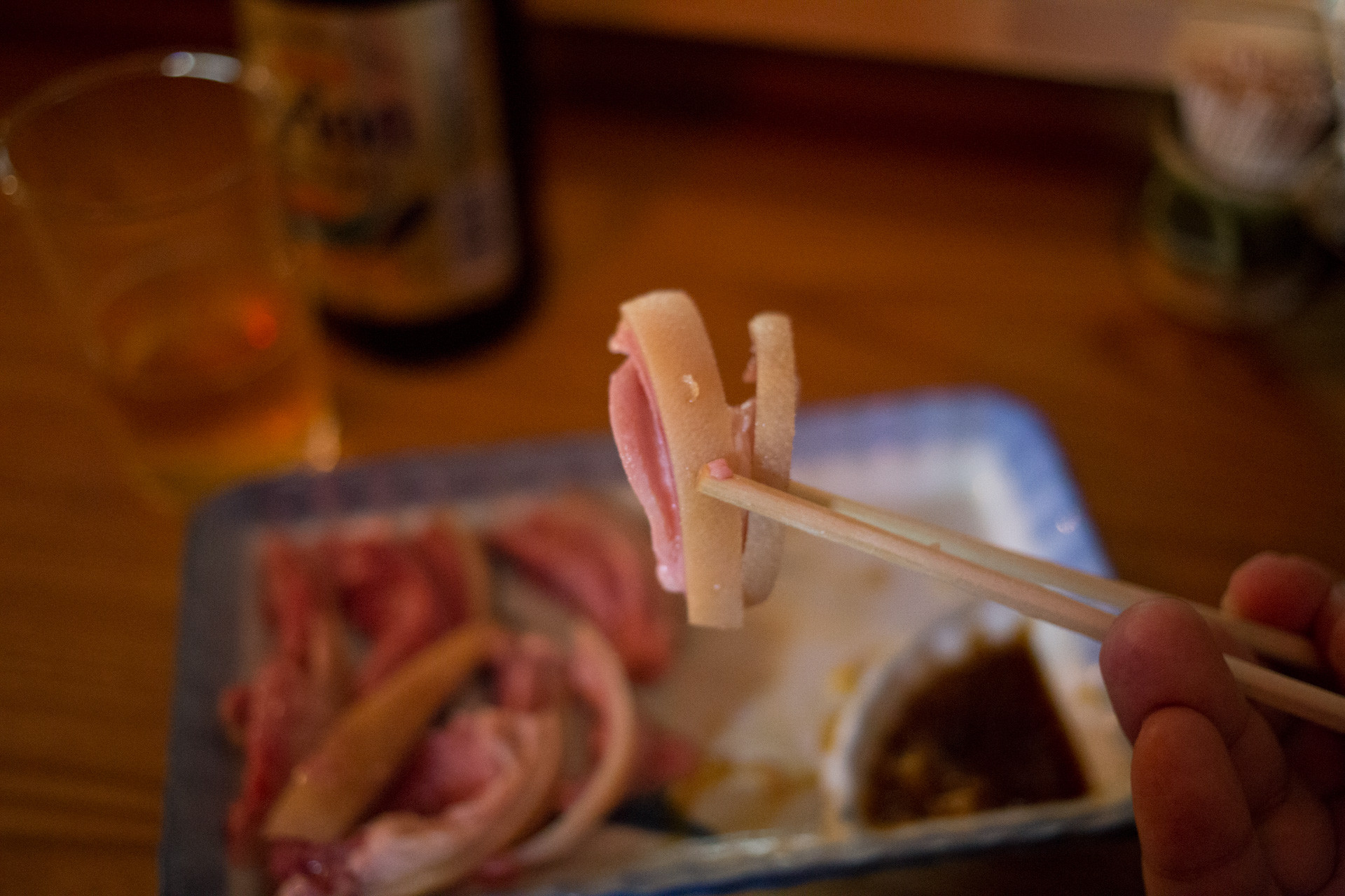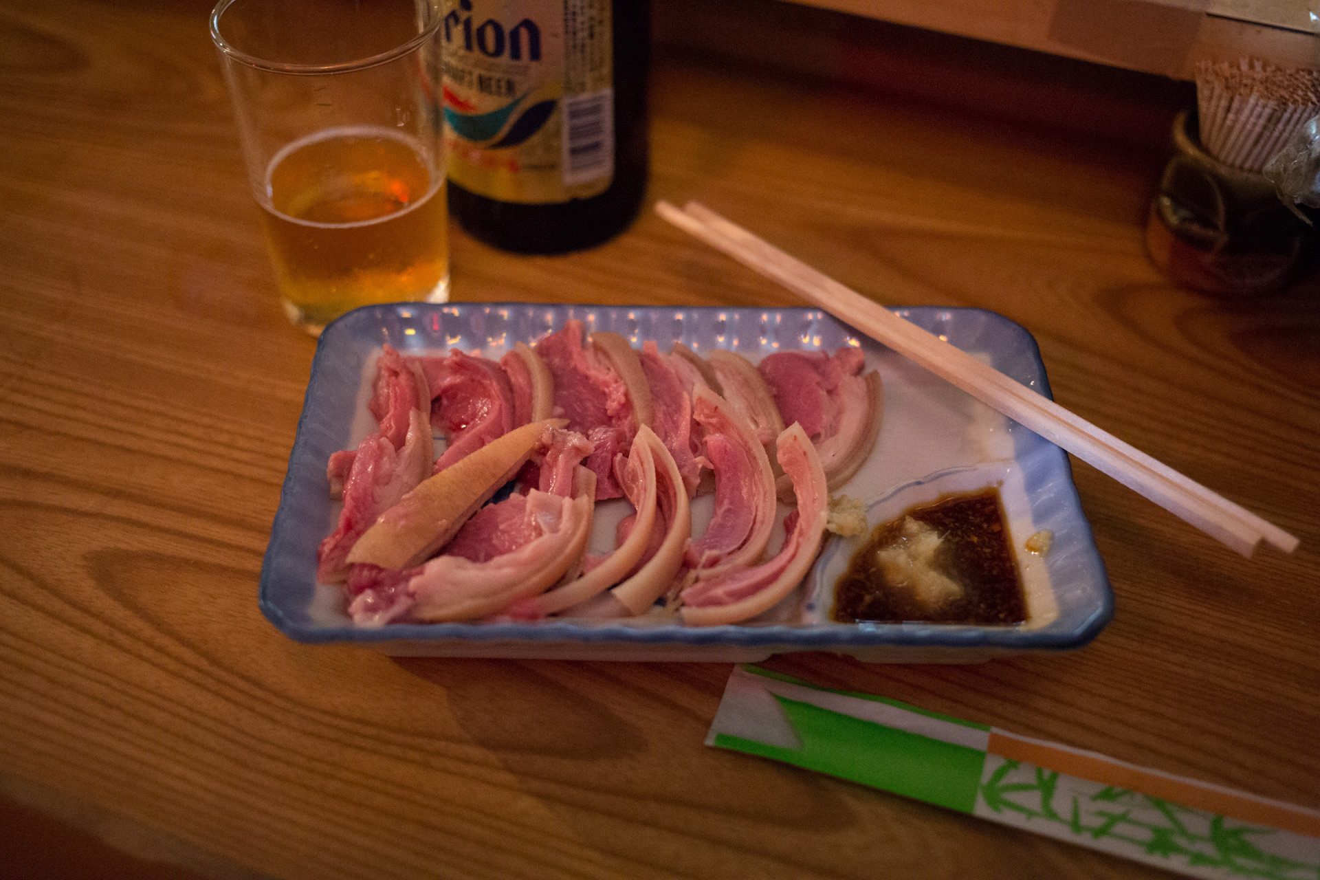 白い部分は皮で、脂身は極めて少なめ。うん、やっぱ肉の刺し身は赤身じゃないと。