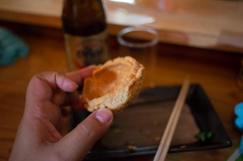 食べてみると、 ややくせのある香りはラム(羊)のよう。 コリコリサクサクとした軟骨っぽい皮の食感も心地よく、生姜醤油とよく合います。