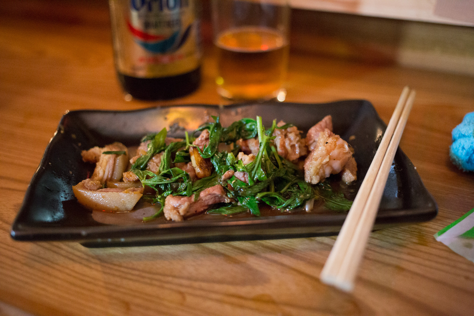 山羊いため。火を通すとまた違った風味でビールがうまい!一緒に炒められている野菜はヨモギのようです。多分。