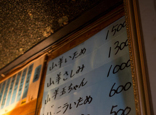壁のメニューには、山羊いため、刺し身と…玉ちゃん…?なんだろう。