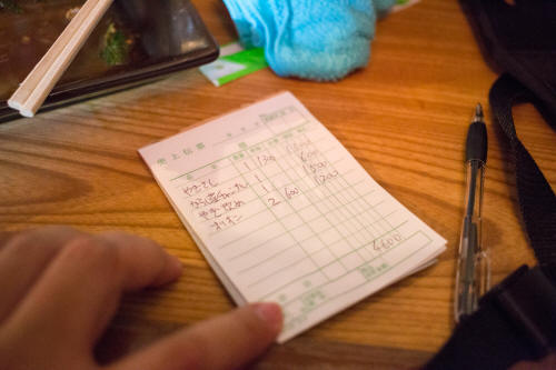 最後にお会計をお願いすると、「何を頼んだか覚えてないから、伝票書いてくれる?」と、