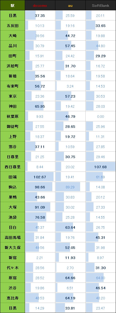 しかし各駅で測定した通信速度の平均速度を集計してみると…なんとauを抑えてドコモがトップに!昨年までは散々だったドコモですが、汚名返上となりました。