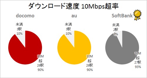また、10Mbps以上のスピードを叩きだした割合を集計してみると、僅差でソフトバンクがトップ、auとドコモは同着2位に。…と言っても、1駅差なので誤差レベルでしょうか。