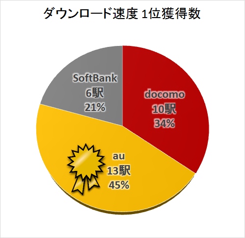 各駅でのダウンロード速度1位獲得数を集計してみると…auが半数近くの45%(13駅)で1位を取り、トップに!最下位はソフトバンクでした。