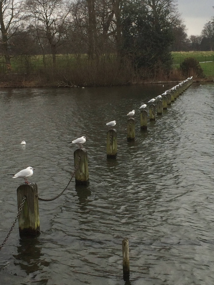 こちらはロンドンにある公園の池で、鳥が柱の上に止まっている写真。