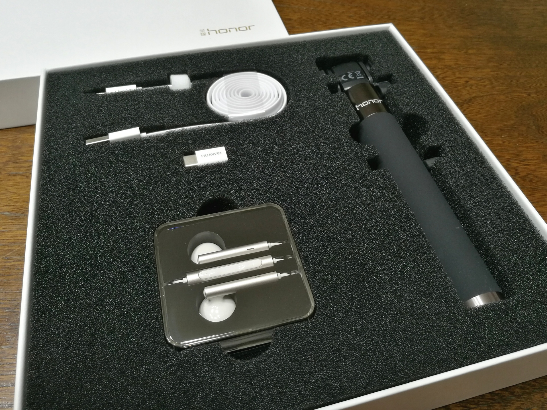 TypeC変換コネクタ、ケーブル、イヤホンの入ったアクセサリーボックスも付属。純正の自撮り棒はちょっと嬉しいですね。