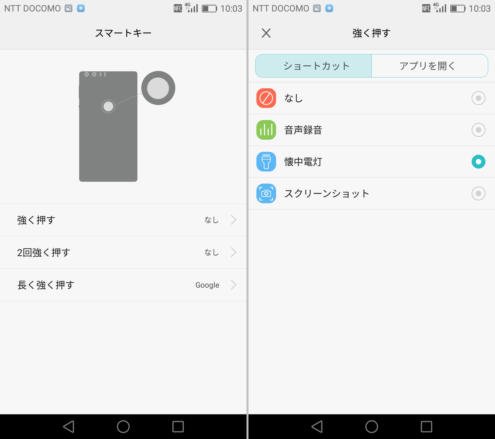 音声録音や懐中電灯、スクリーンショットやカメラに任意のアプリなど、3種類の押し方で一発で呼び出せるので、いちいちロックを解除してアプリを起動して…なんて操作の必要がなくなります。