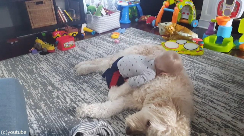 赤ちゃんが犬の上で「もふもふのベッドだ、わーい!」(動画)