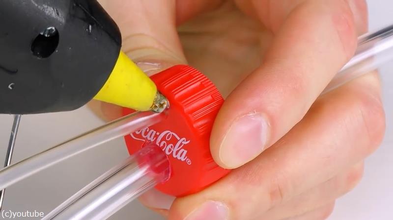 お次は好きな飲み物のキャップに大小2つの穴をあけて管を通し、ホットボンドで接着します。