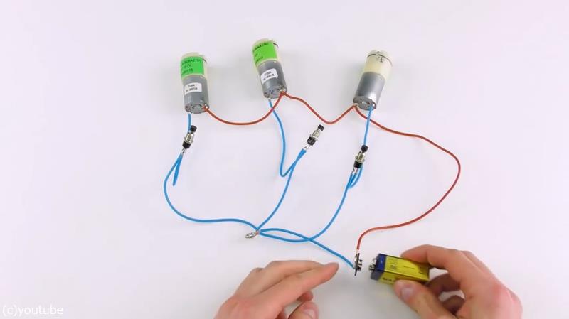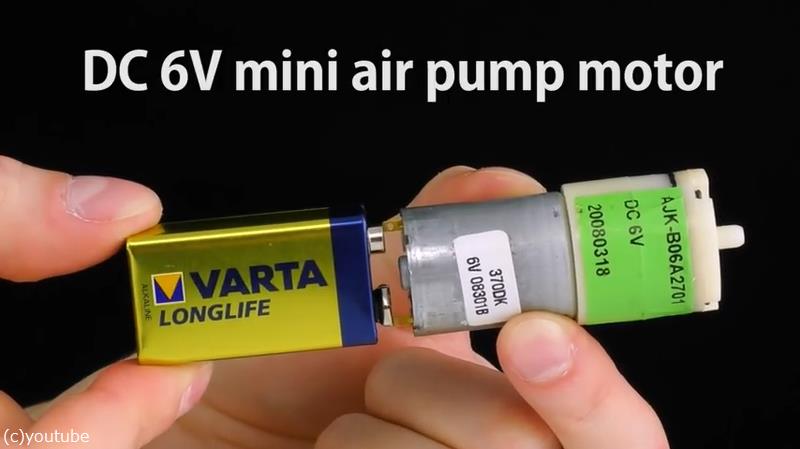 まず用意するものは、9V形乾電池と小型のエアポンプモーター(DC 6V)、そして小型のボタンスイッチ。