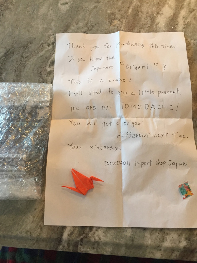 ●Gショックをその店から買ったことがあり、同じような手紙と鶴が来たよ。買い物とサービスはいいが、配送が他のところより遅かった。2つの時計を日本の他のバイヤーから買い1〜3週間で届いたが、トモダチは2か月かかっていた。