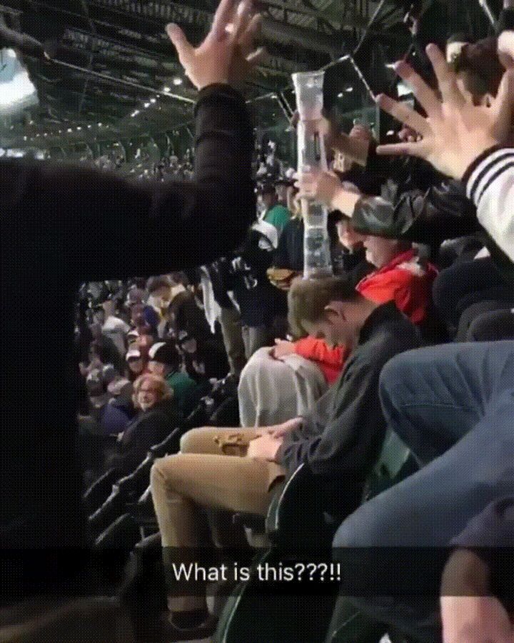 野球観戦中に眠りこけてしまった男性。すると横の友達が、彼の頭の上にドリンクカップを積み始めました。