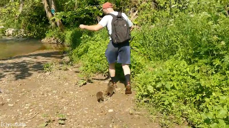 「釣りをしていたら…アライグマの赤ちゃんが追いかけてきた」(動画)