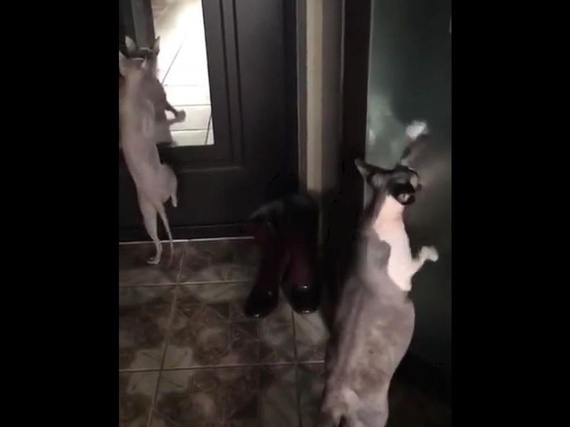 鏡に映る自分を見て興奮をしたのか、ノリノリのダンスを踊り始める猫。
