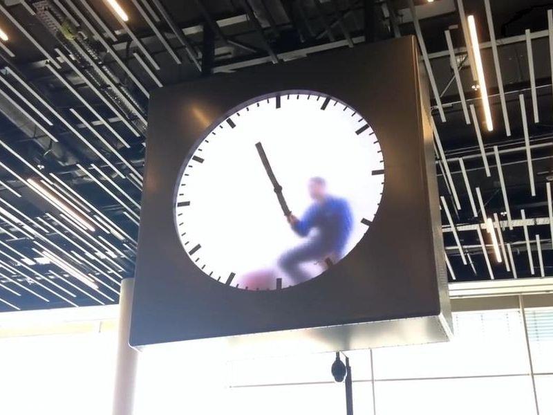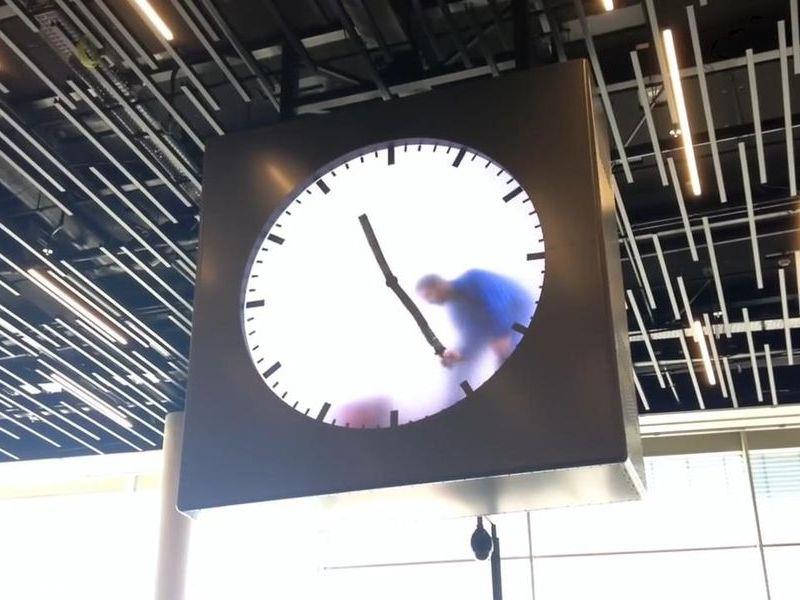 中にいる男性が、時計の針を消しては書いてを毎分ごとに繰り返すというもので、昨年(2016年)に設置されて以来、多くの利用者を驚かせてきました。