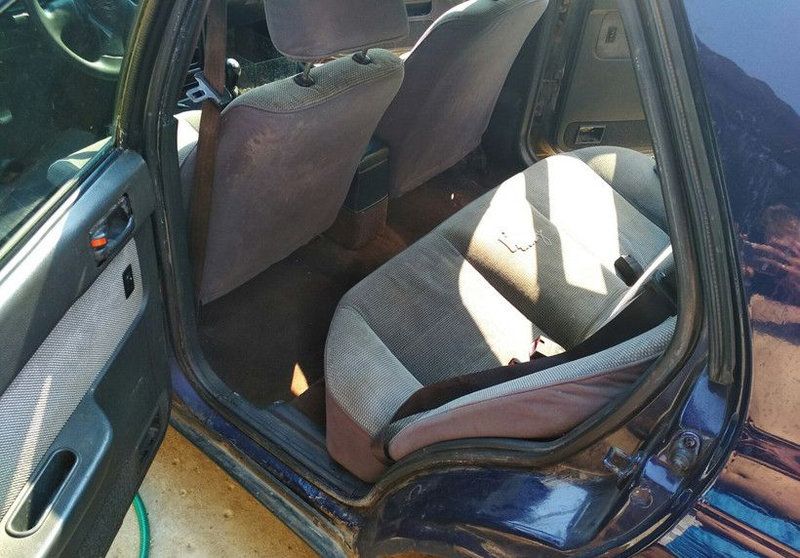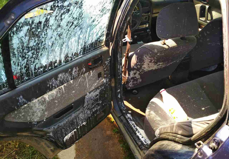 後部座席には、白いボトルタイプのヨーグルト。フタが開いていて、中身が窓や運転席の後ろまで飛び散っています。