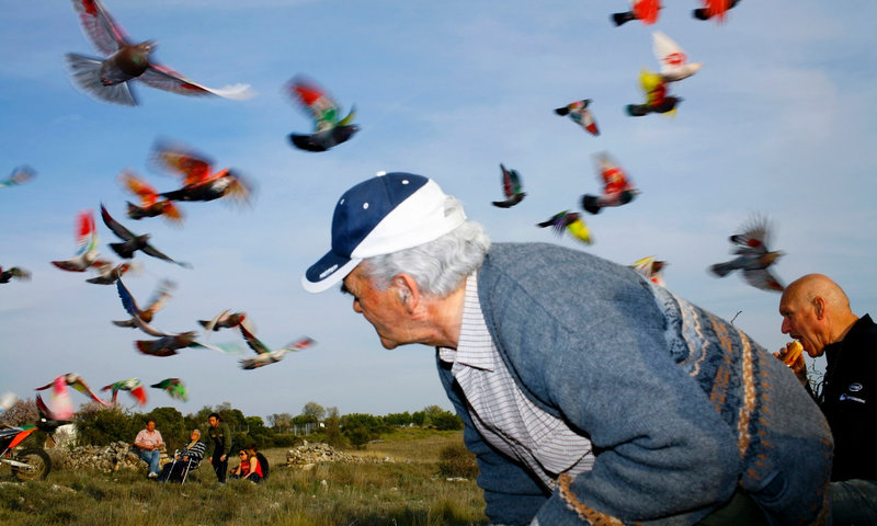 ↑スペイン人はレース用のハトに鮮やかな色を塗る。