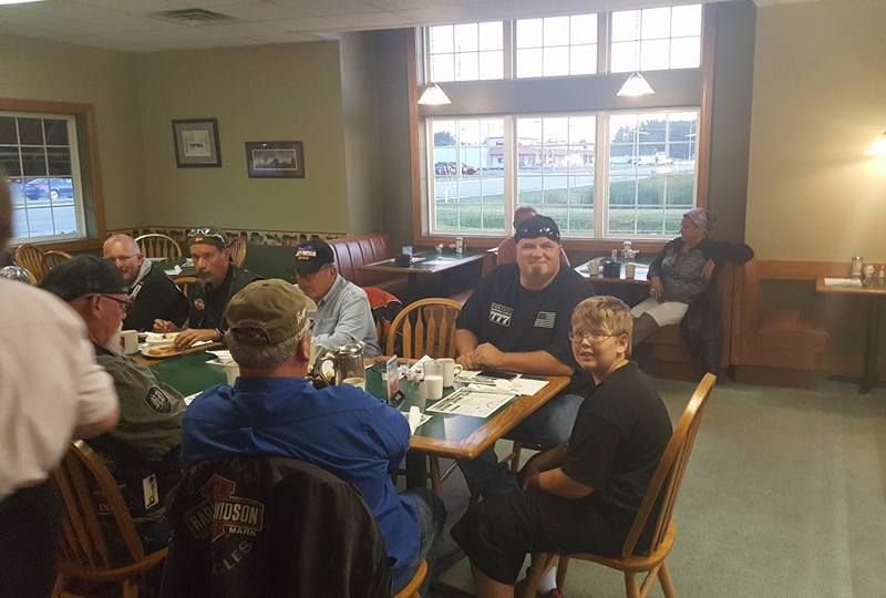 中学初日の直前に集まり、フィル君と一緒に朝食をとるバイク乗りたち。