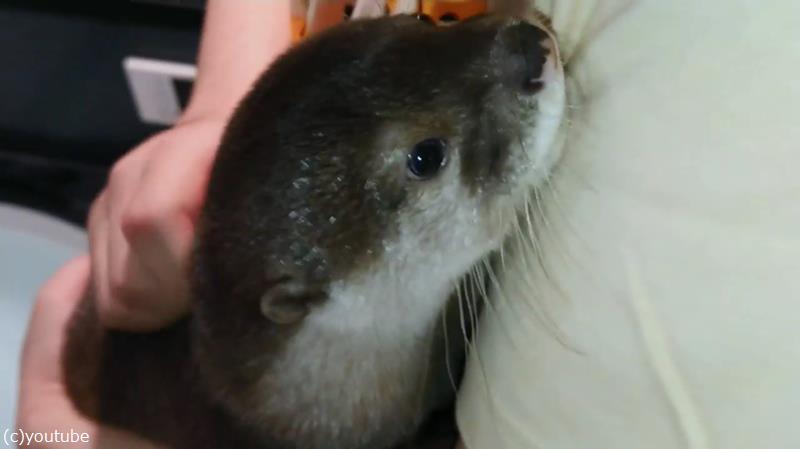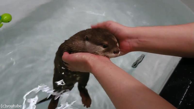 これから生まれて初めてのお風呂に入るという、コツメカワウソのちぃたん。