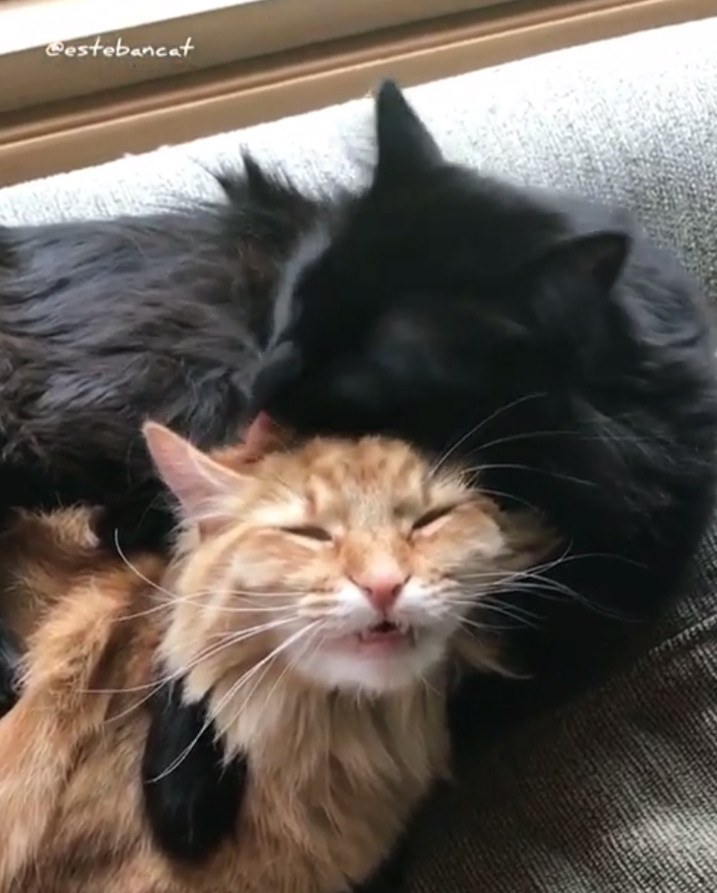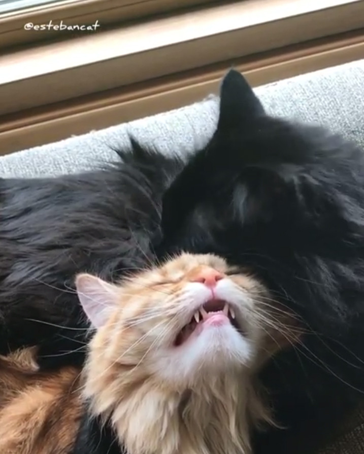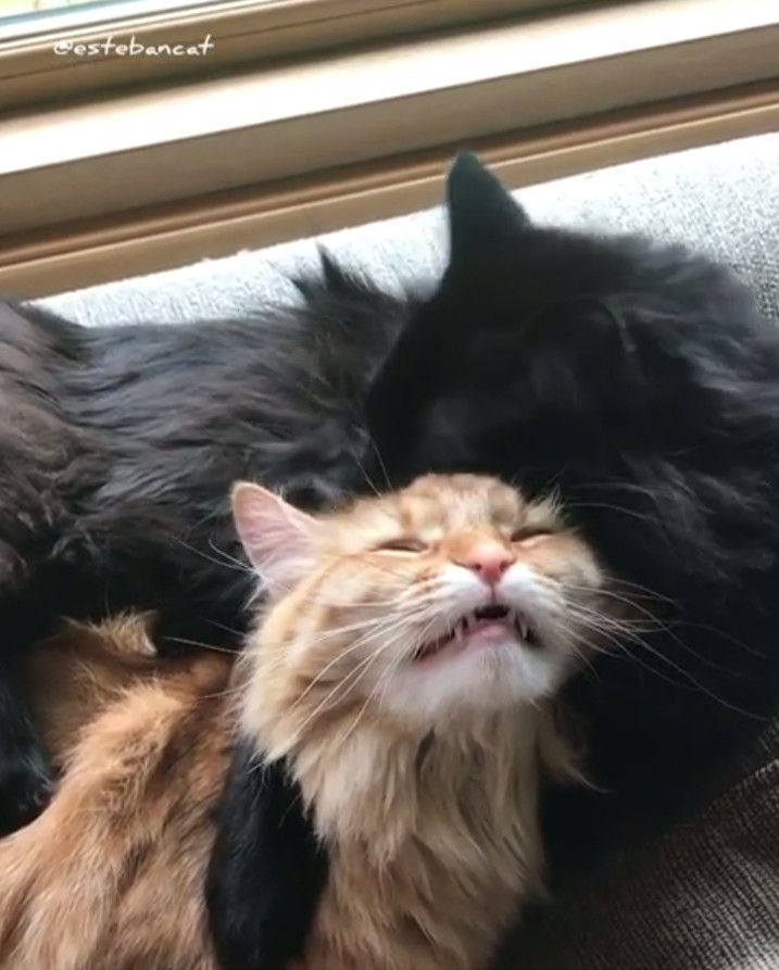 毛づくろいする仲良し猫…表情に異変が「ぺろりぺろり」「ぐぎぎぎぎぎ……」(動画)