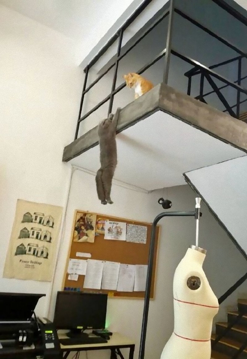 危機一髪な状況のグレーの猫。それを上から見下ろす茶トラ。2匹がどんな関係かわかりませんが、まるで映画の1場面のようです。