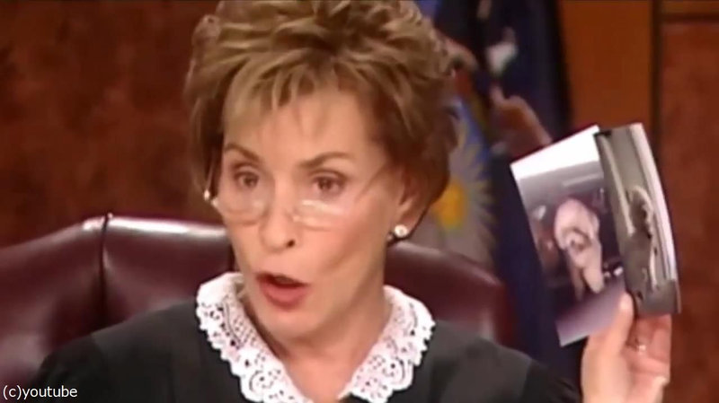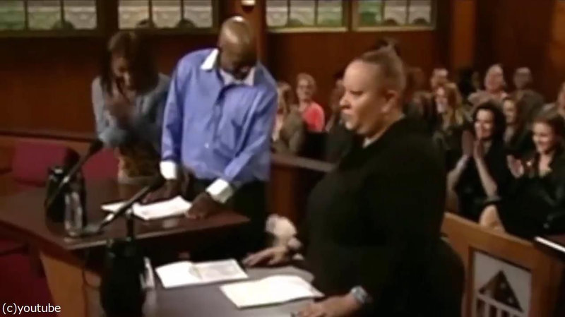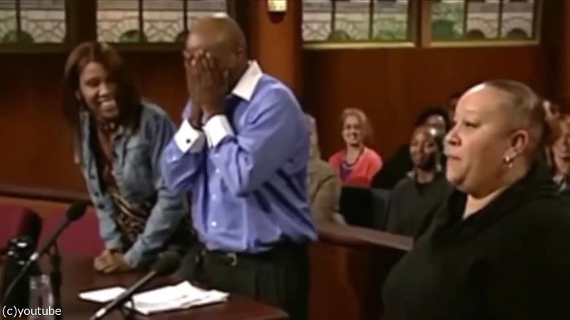 裁判風のテレビ番組「ジュディ判事」で、それぞれの言い分を述べる男女。
