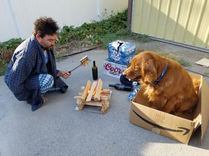 まるで避難所暮らしのような、みすぼらしい夫とワンちゃん。