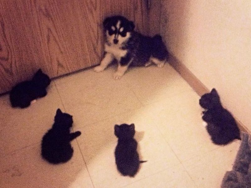 本来は元気いっぱいのハスキー犬が、こんなに追いつめられるとは、子猫たちのパワーも侮れませんね。