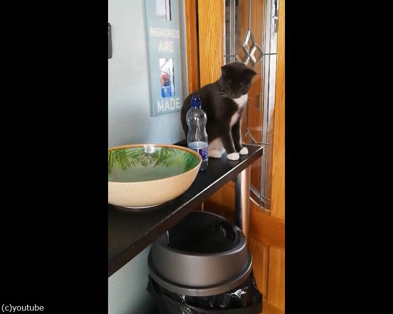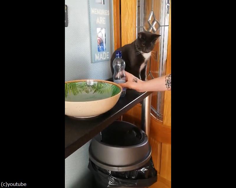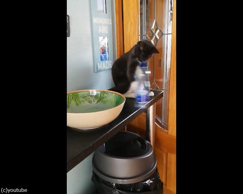 やはりすかさずネコパンチをお見舞いし、ペットボトルを落とす猫。
