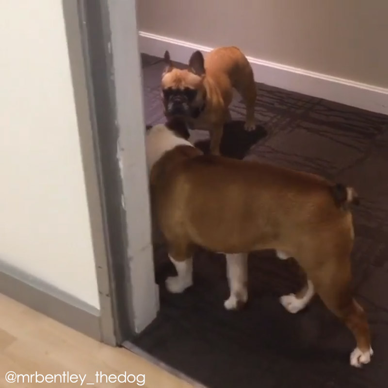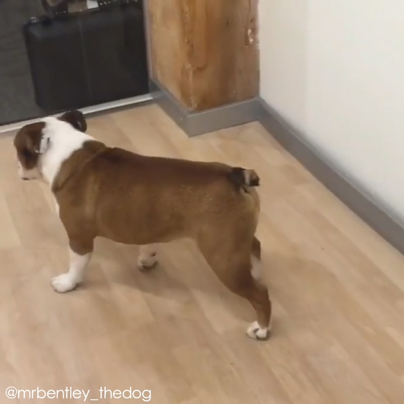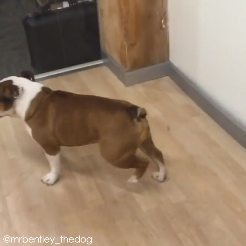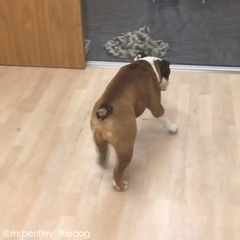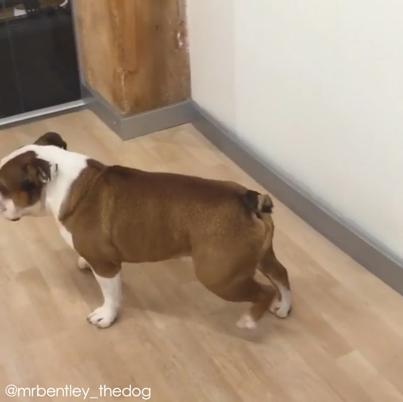 ブルドッグのミスター・ベントレーくん。フローリングの床に差し掛かると、何やら体勢を変えて……。