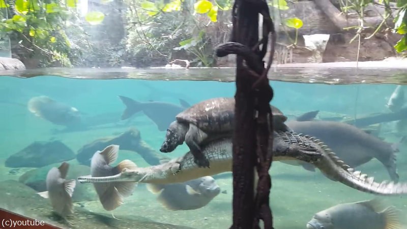 「わしも乗せてくれ」と声が聞こえてきそうな、ワニの背中に乗る亀(それも大型)をご覧ください。