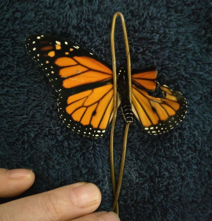 発見者のロミー・マクロスキーさんは、数日前に死んだ別のオオカバマダラの羽を移植することにしました。