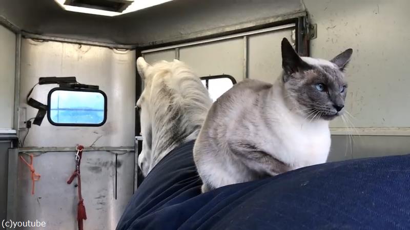 バランス能力に優れ、高いところ好きな猫にとって、馬の背中の上は特等席なのかもしれませんね。
