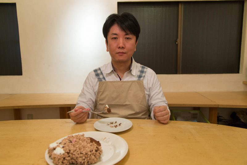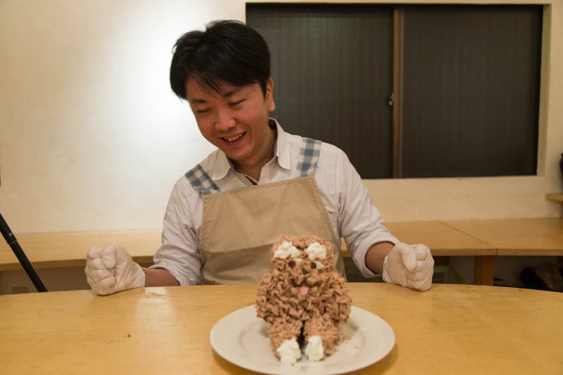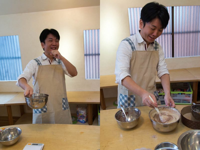 実際にケーキを作ってみて、いかにケーキ作りが繊細で大変か理解した編集長。
