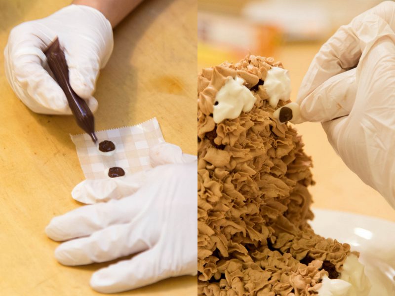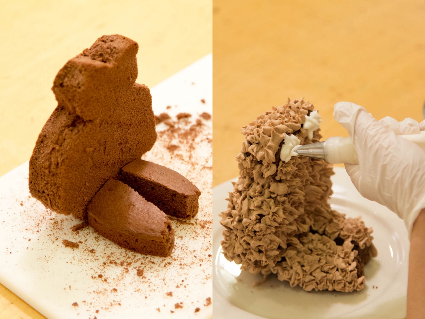 ケーキ作りはいよいよ大詰め。スポンジをクマの形にカットし、クリームでデコレーション。