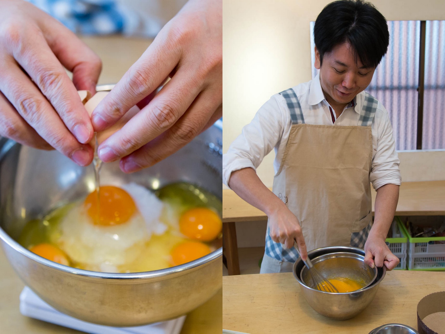 さっそくスポンジケーキ作りから取り掛かる編集長。まずは湯煎しながら卵をかき混ぜると…